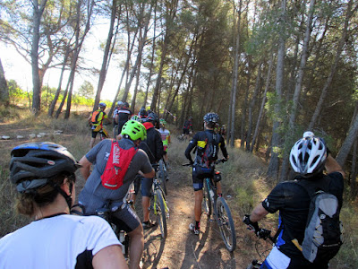 Comenzamos la primera subida dura del día, bastante pendiente y con mucha piedra, no nos toca otra que echar el pie al suelo ya que hay muchos bikers parados y subiendo andando, tenemos que hacer unos cuantos metros andando, a mi ya viene bien ya que mis rodillas en estas subidas sufren más de la cuenta. Al llegar arriba subimos en la bici y a rodar, seguimos por pistas y comenzamos con otra subida esta bastante más larga con algunos tramos durillos, hay bikers subiendo andando, acabamos la subida y seguimos por caminos anchos y buenos hasta que nos adentramos en la montaña, el camino se va estrechando y comenzamos con el primer sendero, pero nuestro gozo en un pozo, hay atasco y esta todo el mundo parado, nos toca hacer este bonito sendero casi todo andando, que se le va a hacer, salimos del sendero y seguimos rodando por pista y poco a poco llegamos al avituallamiento, me viene bien un poco de descanso para mis rodillas.