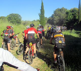 Salimos de la calle y entramos en pista, una pista espectacular, larga y muy divertida casi todo en bajada y con varios toboganes, me encanta. esta pista nos lleva a la riera, pero justo antes de entra en la riera , hay un control que nos desvía a la izquierda, pero con la mala suerte de que a los que han pasado primero, que son muchos, no les dice nada y siguen recto. Cuando se dan cuenta y les avisan vuelven sobre lo recorrido, algunos parecen energúmenos insultando al chico del control, señores y señoras, es un error , sí, pero nada más, aquí nadie se juega nada, todos van a ganar lo mismo, no es una carrera es una marcha NO competitiva, así que simplemente un error, bastante mal lo pasó ya el chico, para que encima lo pusieran verde, hay que tener en cuenta que no está cobrando nada, que lleva días preparando los recorridos y que mientras nosotros lo estamos pasando bien, el está ayudando para que pasemos un gran día. Se ha equivocado, si, pero simplemente habéis echo unos cuantos km más y por el mismo precio. Así que un abrazo para el chico y darles las gracias por todo. Seguimos con la crónica, nada más girar a la izquierda, nos encontramos con el primer parón, pasamos de ir por una pista bastante ancha a un sendero para una bici, así que nos toca esperar un poco, aprovecho para hacer alguna foto, ya que en la bajada íbamos bastante rápido y no pude hacer fotos, mientras esperamos , veo que el Xavi esta esperando a la sombra , me uno a el y proseguimos la marcha, haciendo un par de paradas más antes de llegar a pasar de nuevo por la linea de salida.